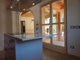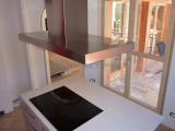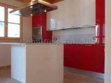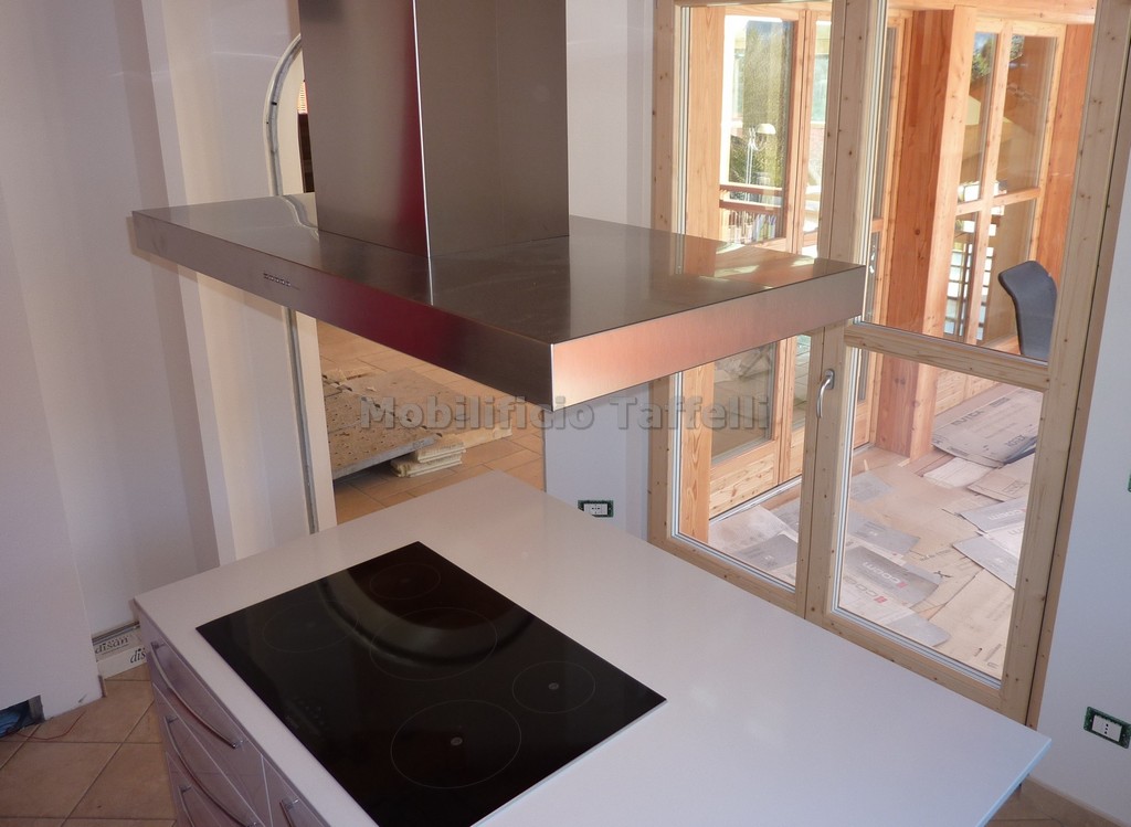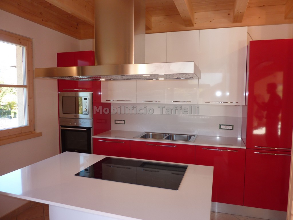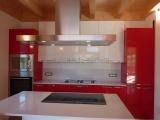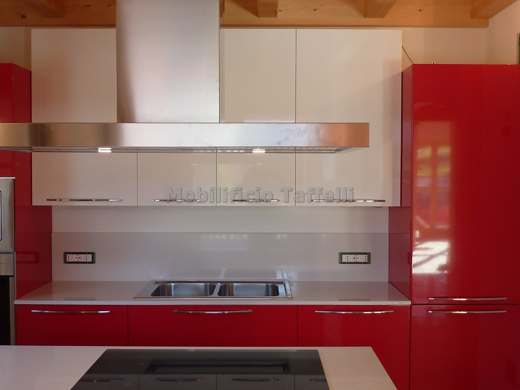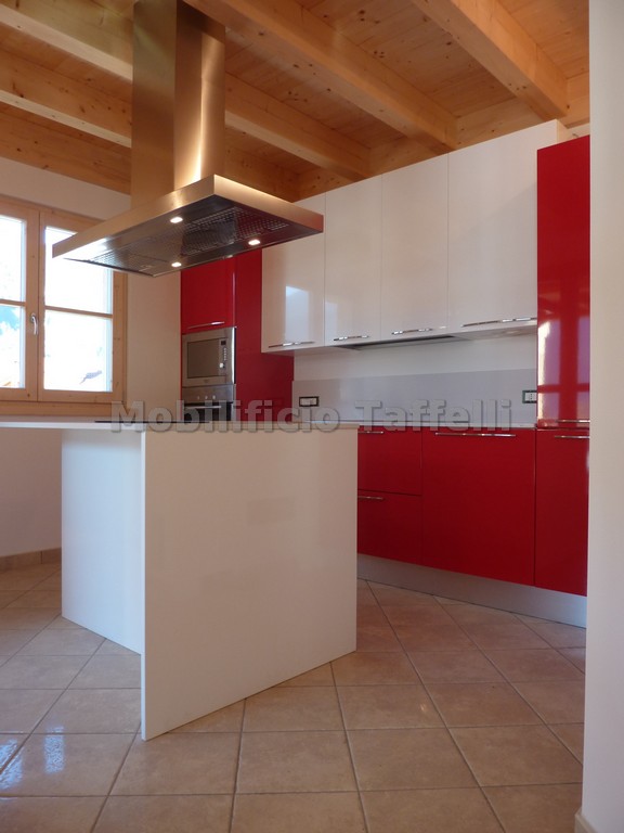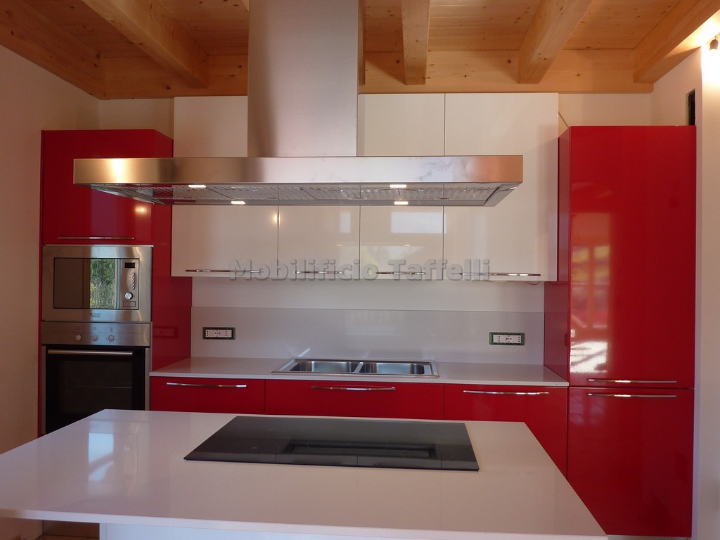 Cucine modello Carrera lucida, bianca e rossa. Piano cottura e cappa ad isola